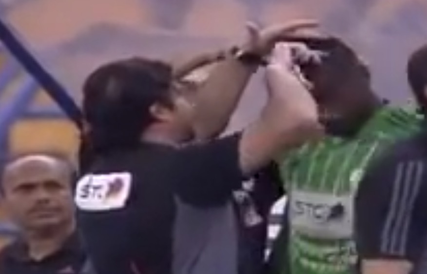 Description : Au début d'un match de foot en Arabie Saoudite, Waleed Abdullah le gardien de but du Al-Shabab FC s'est vu obligé de se faire couper les cheveux avant de commencer à jouer pour être en accord avec la loi islamique, en effet celle-ci interdit les coupes "fantaisistes".