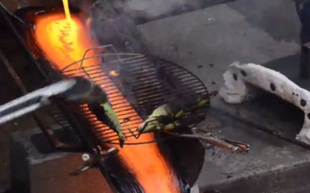 Ou ça une coulée de lave ? C'est du laitier en sortie de fourneau, et vu la couleur, d'une aciérie plus exactement. Bon, c'est pas donné a tout le monde de le savoir, mais ce genre de truc (le barbecue au dessus de la coulée) on l'a tous fait au moins une fois en bossant dans la métallurgie.