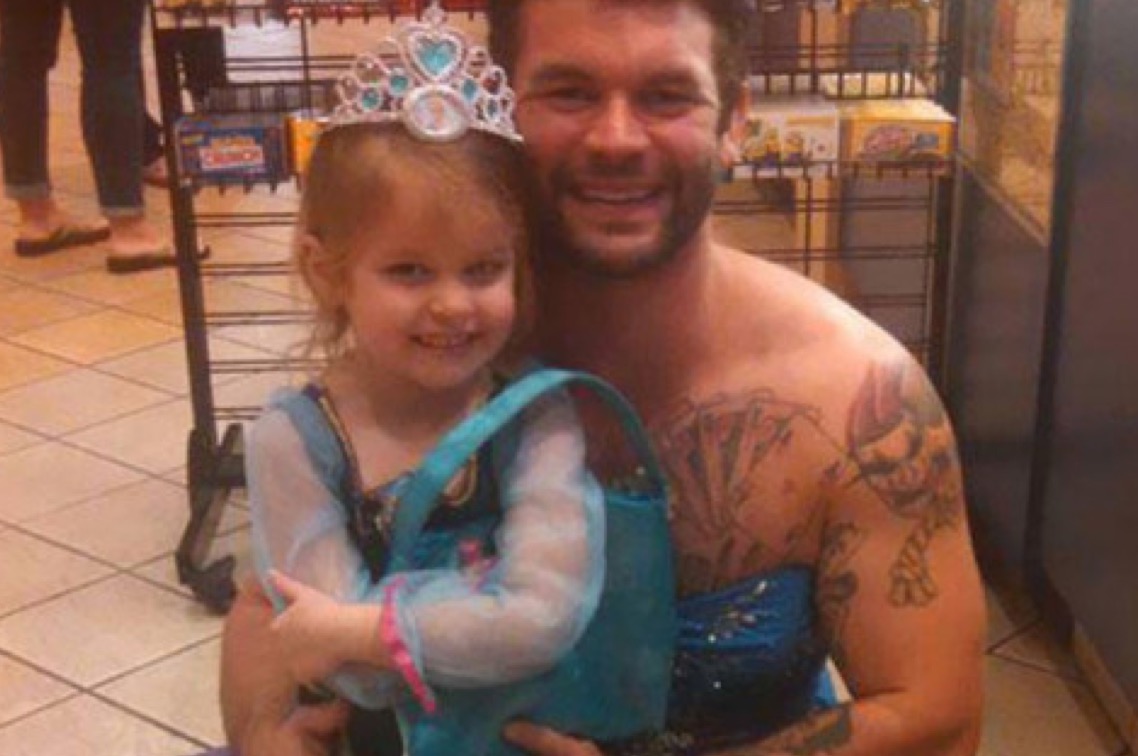 Du coup pour être sûr que sa nièce Izzy ne vive pas cela, cet oncle génial qui répond au nom de Jesse Nagy a décidé de l'accompagner en se déguisant lui aussi en princesse de Cendrillon.