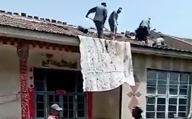 Description : Pour envoyer leur ciment sur le toit ces ouvriers chinois ont une technique simple, rapide mais pas sans risque.