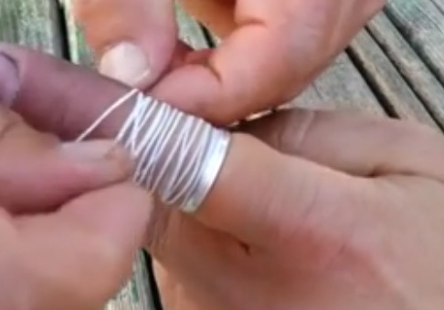 Description : Un homme nous montre comment retirer à l'aide d'une ficèle une bague ou un simple alliance coincée sur un doigt.