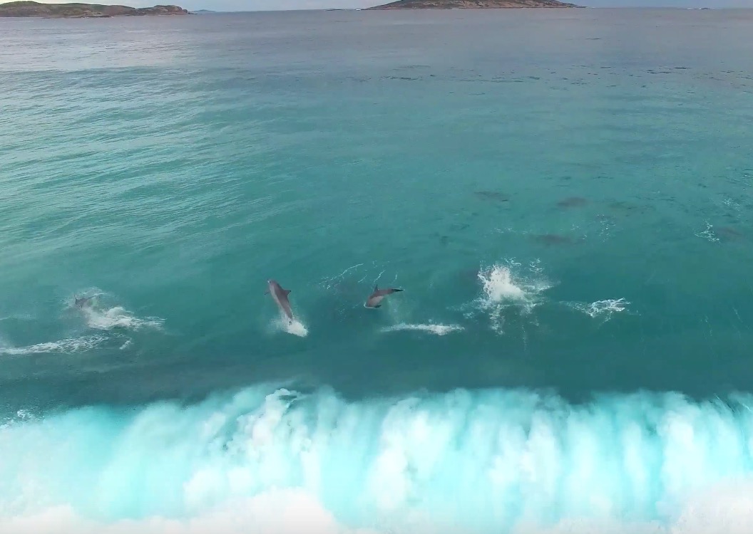 Description : A Esperance en Australie des dauphins attendent les vagues pour s'amuser à surfer et sauter.