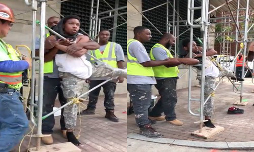 Des ouvriers attrapent un voleur et l'attachent à leur échafaudage