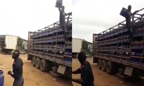 Description : En Afrique deux mecs chargent leur camion de bonbonnes de gaz en utilisant une technique aussi physique qu'efficace.