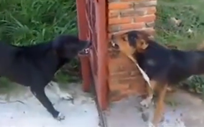Embrouille entre deux chiens séparés par une barrière
