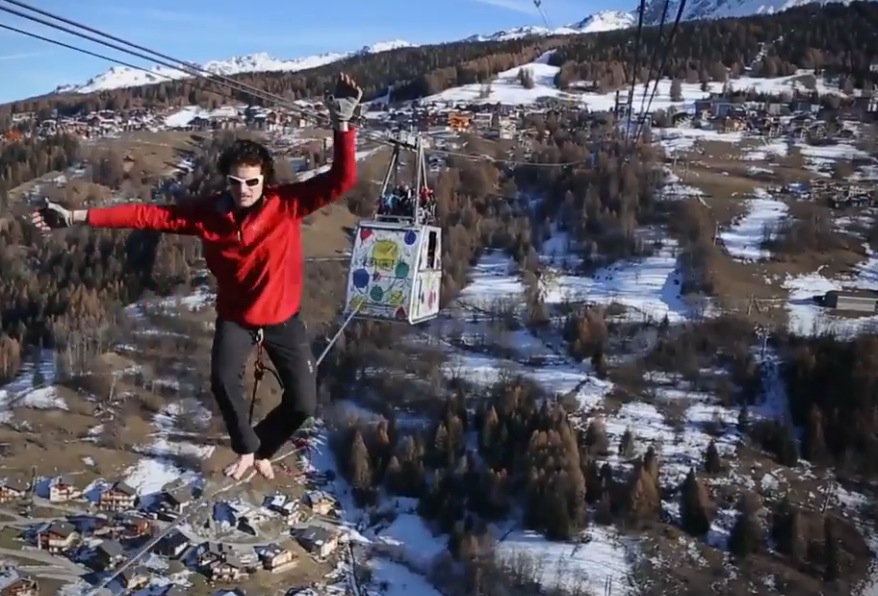 Description : Le 16 décembre pour l'opération Paradiski Gravity, les funambules Julien Millot et Tancrède Melet, ont relevé le défi de traverser la ligne téléphérique du domaine skiable, sur les pieds à 380 mètres du sol.
