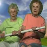 Description : Deux grands mères simulent une descente de montagne devant un écran vert. On s'amuse comme on peut...