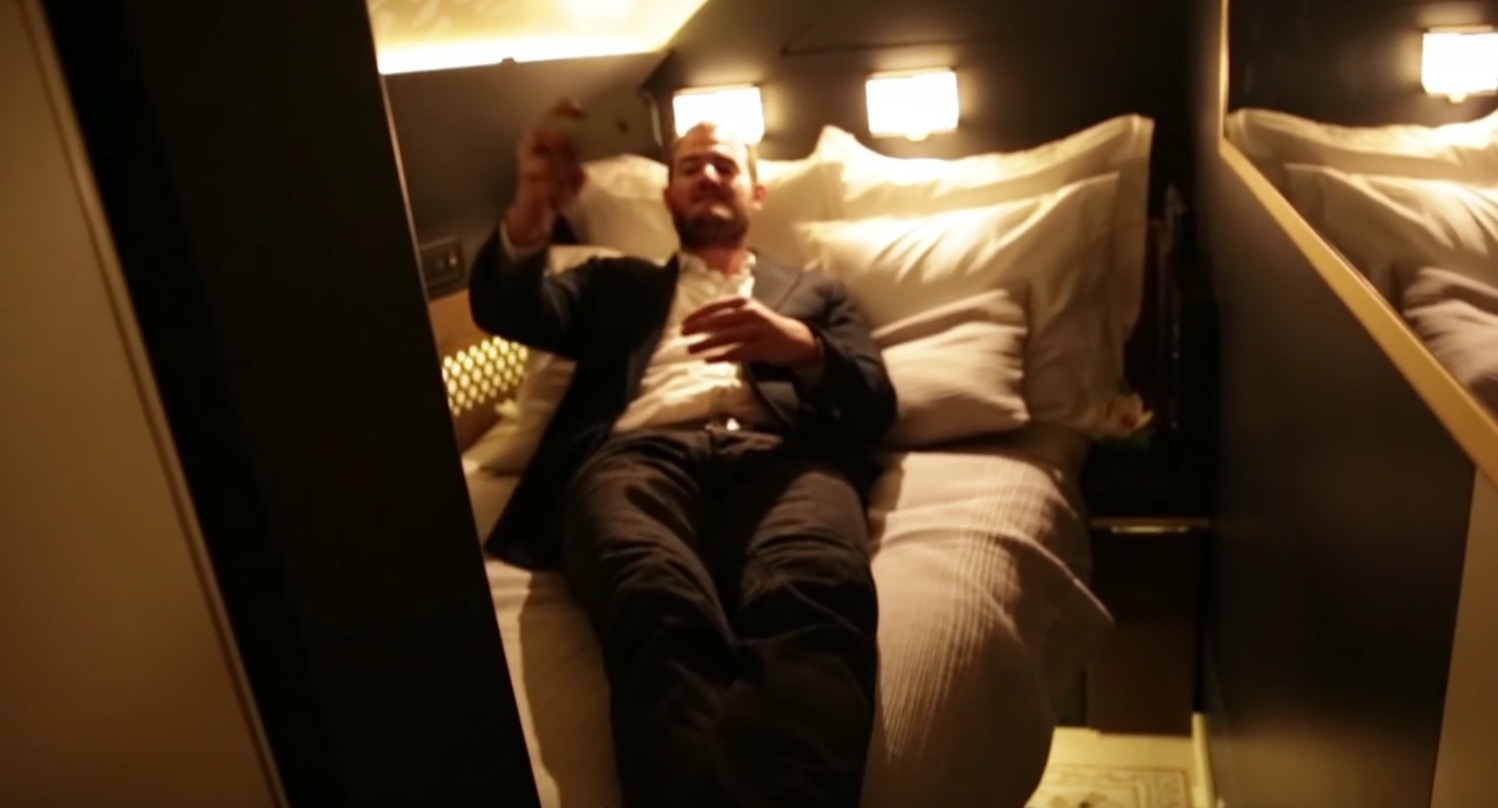 Description : L'américain Brian Kelly s'est offert un vol Etihad de New York à Abu Dhabi à 32000 euros, la superclasse quoi, évidemment à ce prix là il a tout filmé de son voyage : douche, lit, salon individuel, gros repas etc...