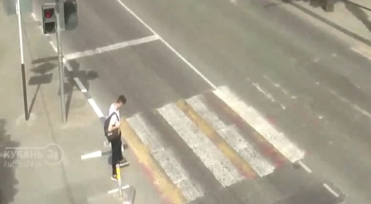 Description : Sur un passage piéton, un homme qui marche avec des écouteurs va traverser sans regarder et prendre un bus de plein fouet.