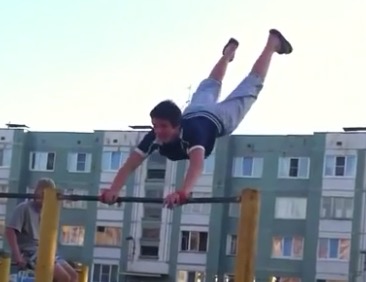 Description : Dans un centre d'exercice en plein air un jeune russe va se déboiter les deux épaules en se balançant sur une barre de tractions.
