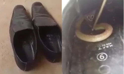 Description : Quand la réalité rejoint la fiction... Un homme utilise un petit bâton pour essayer de faire sortir un serpent de sa chaussure.