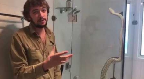 Description : A Noosa (Queensland) en Australie, un homme a été appelé de bon matin pour venir en aide à une fille qui s'est réveillée avec un gros python dans leur douche. D'après ses dires, en ces temps de sécheresse et grosses chaleurs, ces derniers aiment se réfugier dans les coins humides et frais.