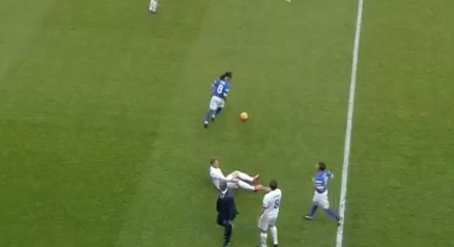 Pendant un match de 3e division anglaise, un supporter du club Charlont Athletic est descendu en courant sur la pelouse pour célébrer un but avec les joueurs de son équipe mais ce boulet a glissé et frappé un involontairement un joueur aux parties.