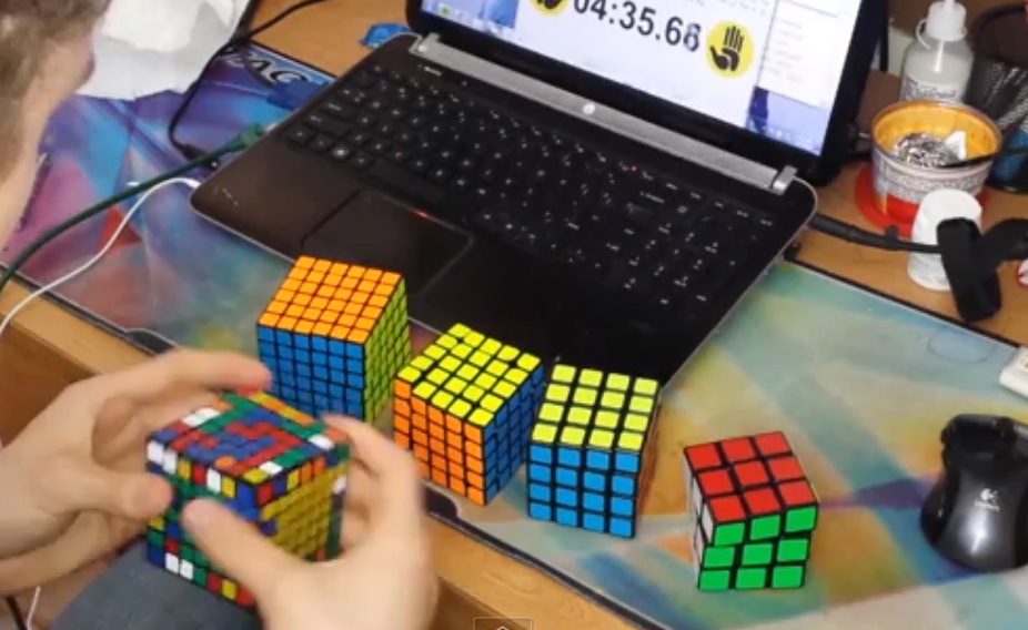 Description : Pour un record du monde Kevin Hays résout 6 cubes du plus simple (2x2) au plus compliqué (7x7) en 6 minutes et 23 secondes.