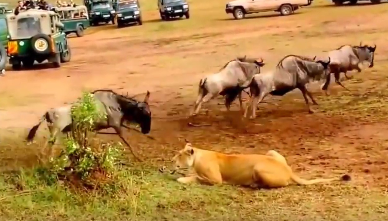 Description : En Afrique lors d'un safari des touristes peuvent admirer la différence entre un lion et une lionne lorsqu'il s'agit de manger donc chasser.
