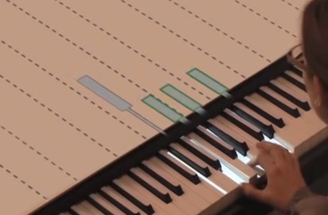 Description : Vidéo démonstration d'un système qui permet d'apprendre le piano plus facilement, en projetant sur l'instrument, à la manière d'un jeu vidéo, les prochaines touches à presser.
