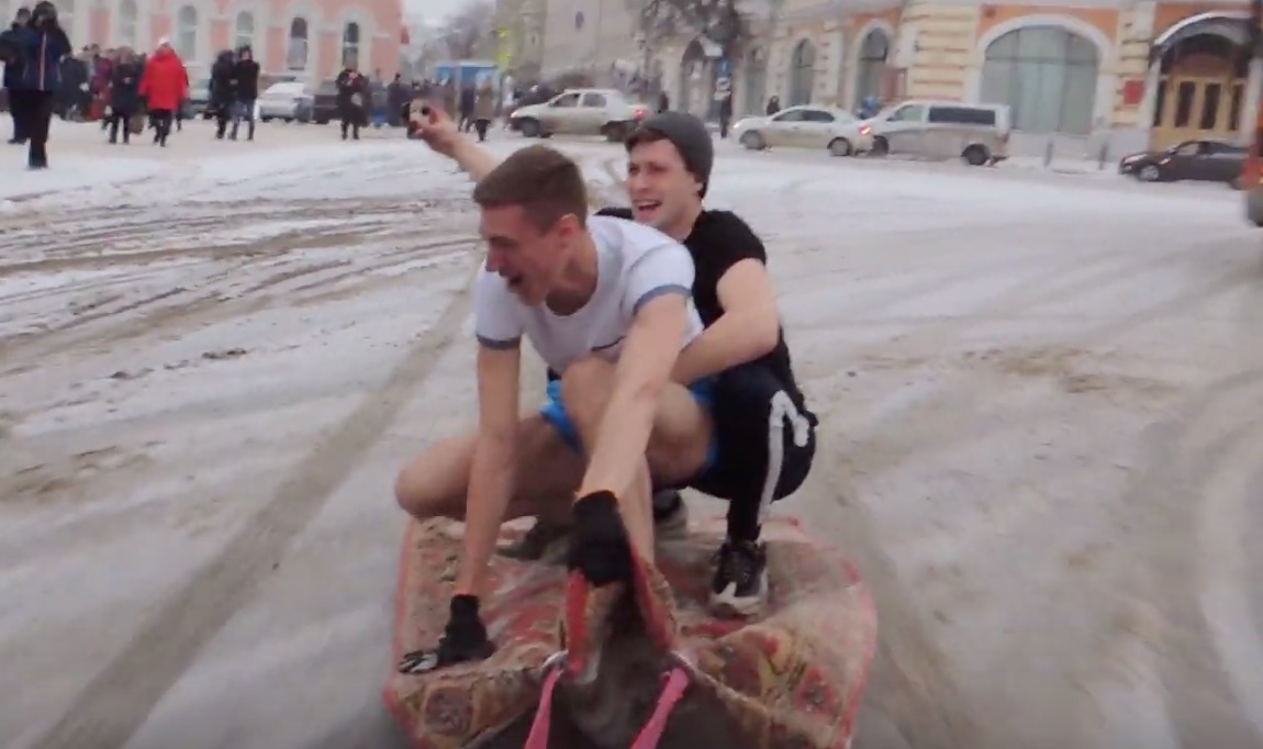 Description : Dans le centre ville de Nijni Novgorod, deux russes se payent une bonne séance de surf avec un tapis tracté par une voiture.