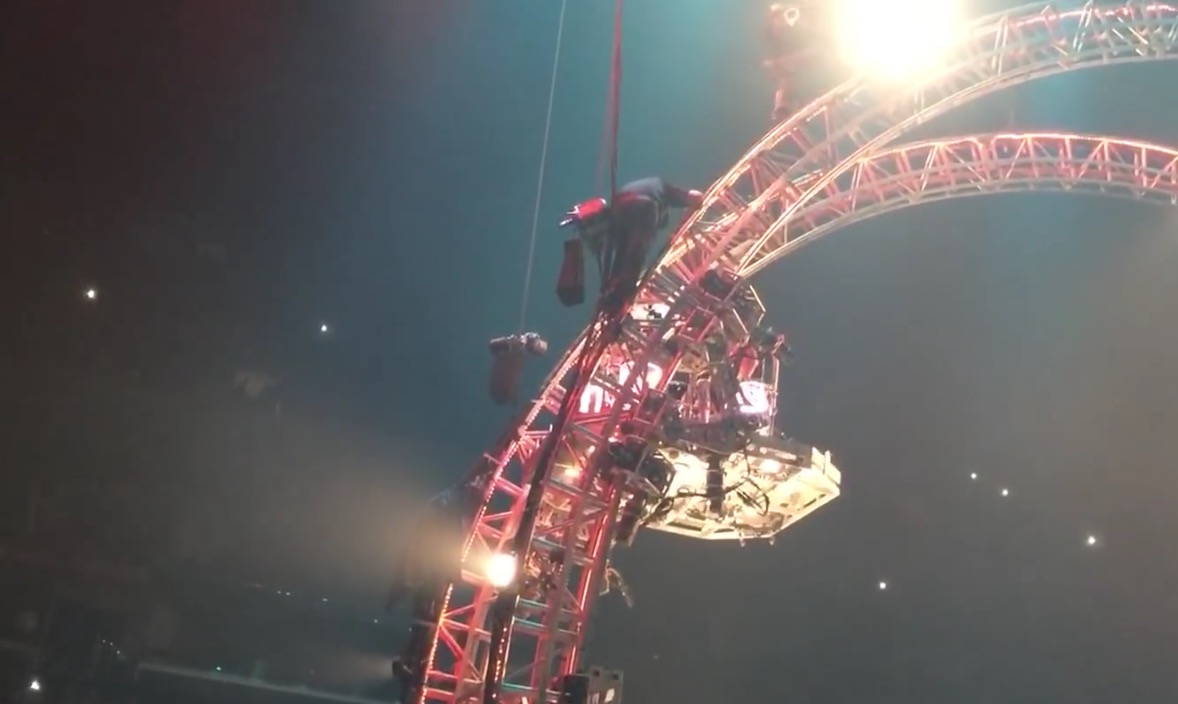Description : Lors de son dernier concert à Los Angeles, le rockeur Tommy Lee est resté coincé 5 minutes la tête en bas sur batterie spéciale, une batterie qui fait beaucoup parler d'elle en ce moment puisqu'elle a la particularité d'être monté sur des montagnes russes.