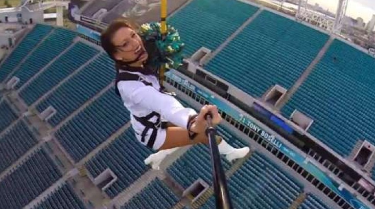 Description : Dans un stade de NFL / football américain, des jolies cheerleaders et des mascottes s'amusent à se balancer en tyrolienne.