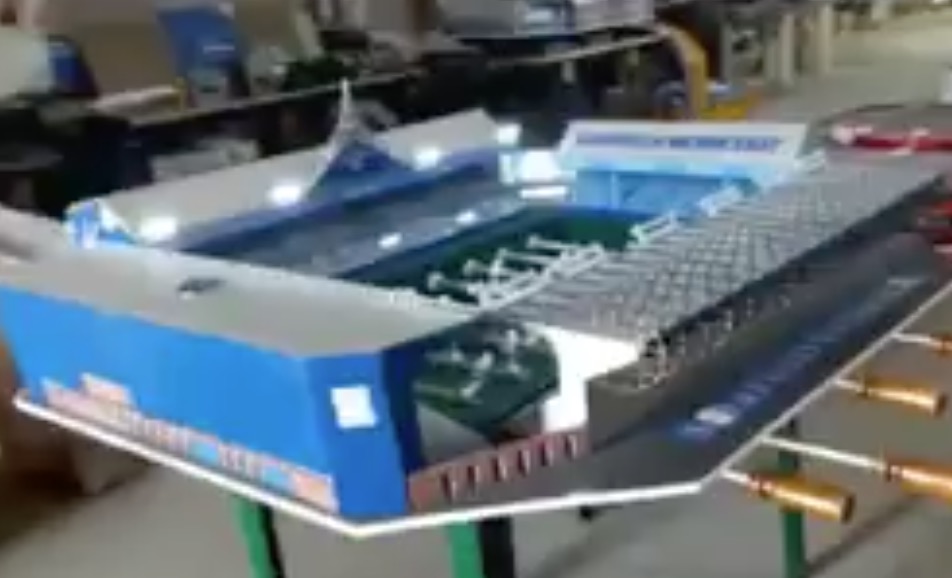 Un babyfoot en forme de stade de foot