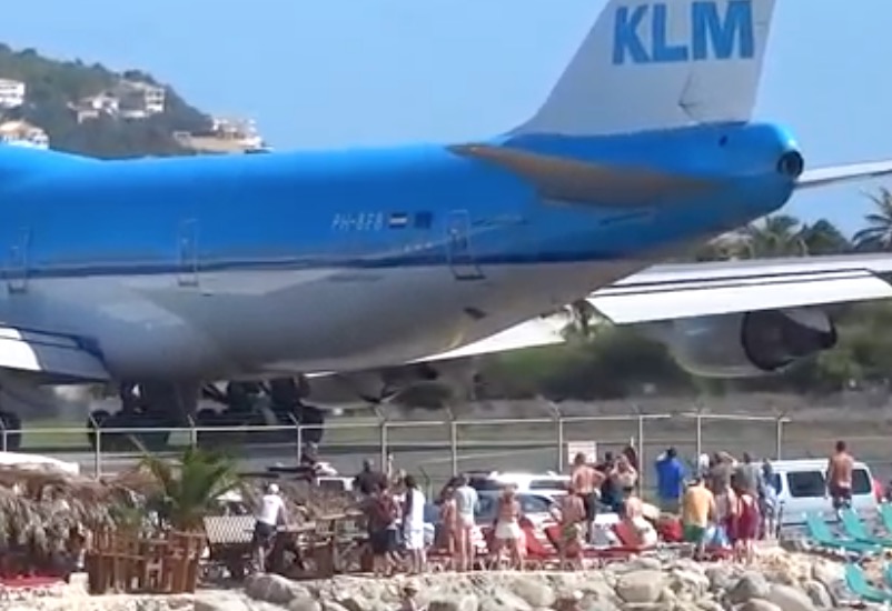Description : Sur la célèbre plage de Maho Beach à Saint-Martin, des touristes en pleine bronzette vont se faire jeter à la mer par les puissants réacteurs d'un Boeing 747 de la compagnie KLM.