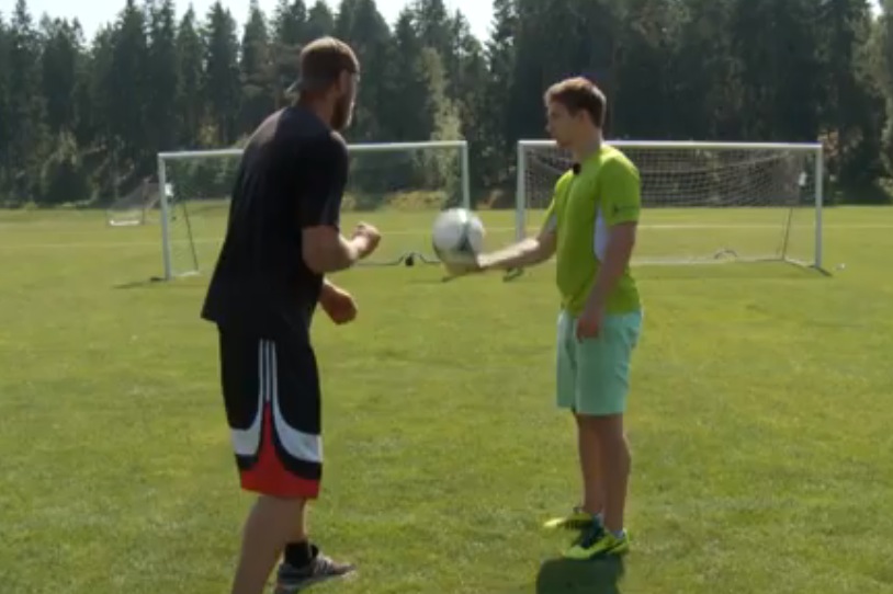 Description : Avec un footballeur à ses cotés le boxeur Robert Helenius va frapper une balle d'un coup de poing.