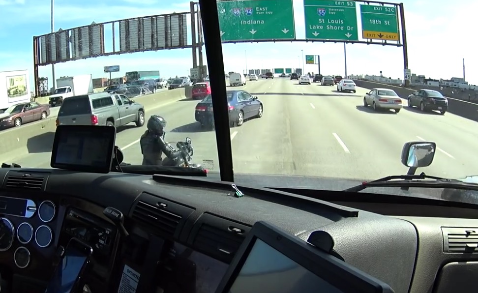 Un camionneur protège une motarde en panne sur l'autoroute
