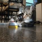 Description : Dans la série "je suis le maître du monde", ce chat qui s'amuse à commander ses croquettes en appuyant sur une clochette.