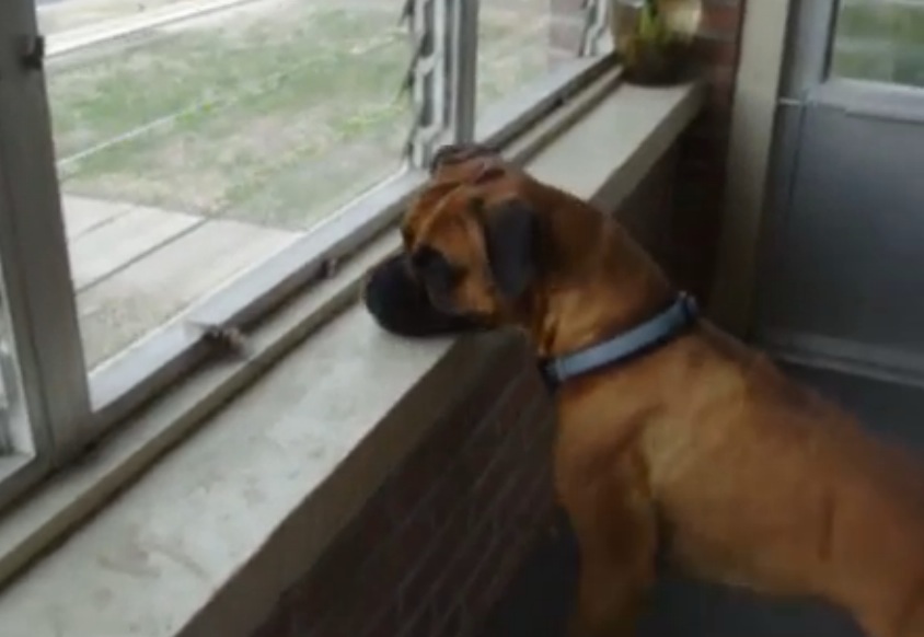 Description : Près d'une fenêtre, un boxer pétè littéralement les plombs devant une simple feuille morte. C'est vrai que ça aurait pu être un putain de papillon...