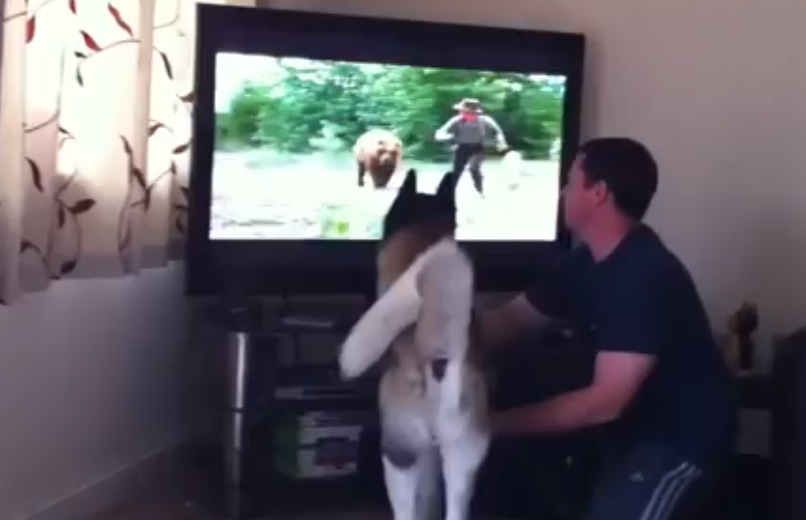 Description : Devant la télévision du salon qui diffuse un film avec un ours, un chien très protecteur va essayer d'attaquer l'animal.