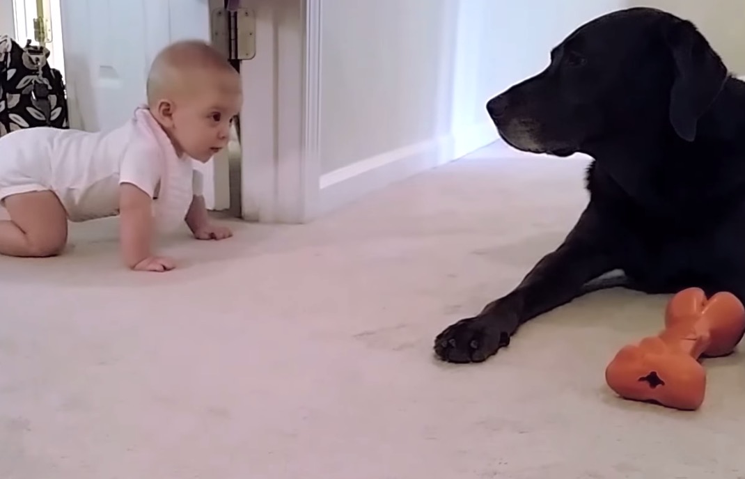 Description : Après avoir enfin réussi à ramper vers le chien de la maison, ce bébé va se faire féliciter par celui-ci.