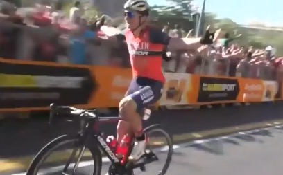 Un cycliste célèbre sa victoire alors qu'il lui reste un tour à faire