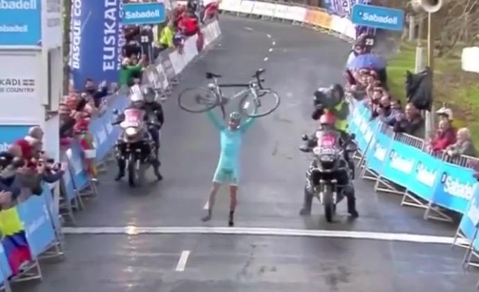 Description : Lors de sa dernière course Diego Rosa avait tellement d'avance sur ses concurrents qu'il s'est permis de passer la ligne d'arrivée à pied avec son vélo dans les mains.