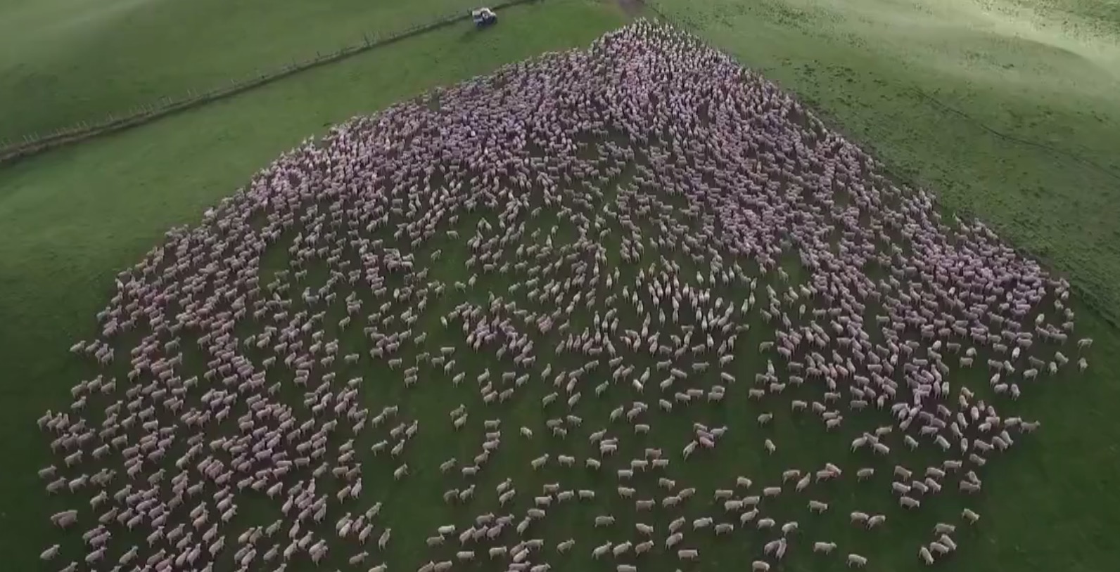 Description : En Nouvelle-Zélande un drone filme un fermier et son énorme troupeau de moutons.