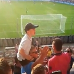 Description : Dans les tribunes d'un match du PSV Eindhoven, un enfant sur les épaules de son père va guider les chants des supporters.