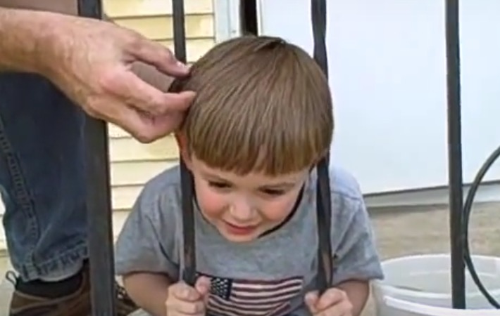Description : Cet enfant s'est coincé la tête entre deux barreaux mais comme vous allez le voir il va trouver une bonne technique pour se dégager.