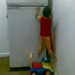 Un gamin escalade un frigo à la Spiderman