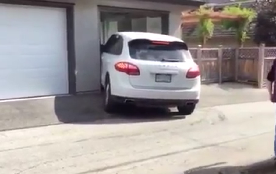 Description : A Vancouver (Canada), un homme visiblement en colère essaie de rentrer de force sa Porsche Cajun dans son garage. La facture va être salée...