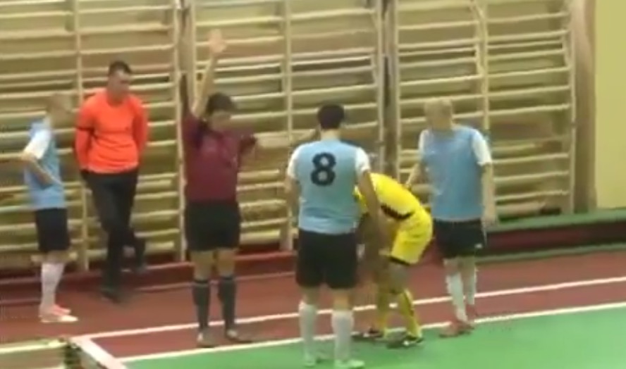 Description : Après s'être pris un carton rouge, bien mérité, un joueur russe de foot en salle va péter un câble et coller une droite à l'arbitre.