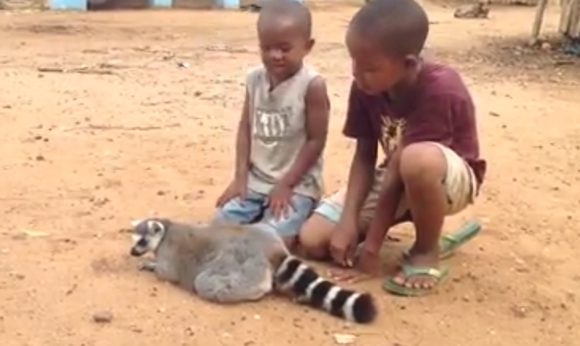 Description : Deux jeunes caressent un lémurien mais quand ils vont s'arrêter celui-ci va rapidement leur faire comprendre qui est le chef.