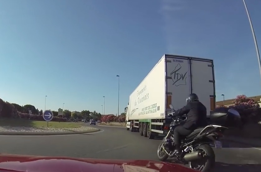 Description : A un rond point près de Nice, une femme filme involontairement le dépassement complètement inconscient d'un motard sur un camion.