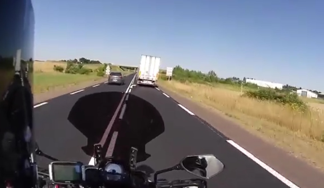 Description : Sur une route départementale près de Luçon en Vendée, un motard français filme un automobiliste qui effectue un dépassement très imprudent. Il ne va pas y aller de main morte sur les insultes...