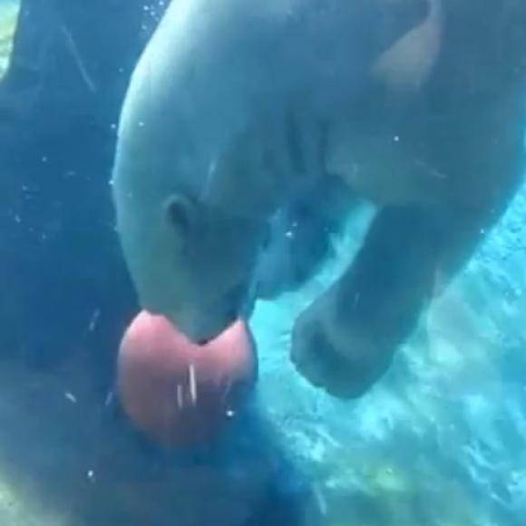 Description : Dans son aquarium géant, un ours polaire montre au public d'un zoo que les blancs savent aussi jouer au basket.
