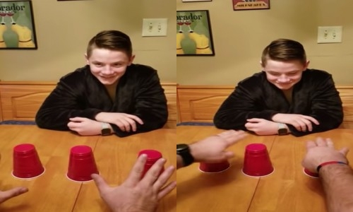 Description : Un père joue au jeu du Bonneteau avec son fils en lui proposant de garder le billet qu'il a placé sous le gobelet s'il arrive à le retrouver mais comme vous allez le voir c'est un peu plus vicieux que ça...