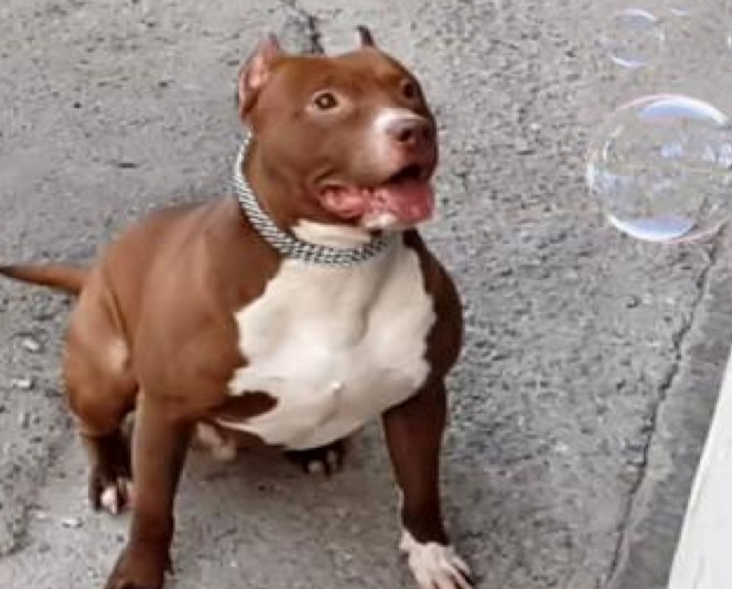Un pitbull joue avec des bulles