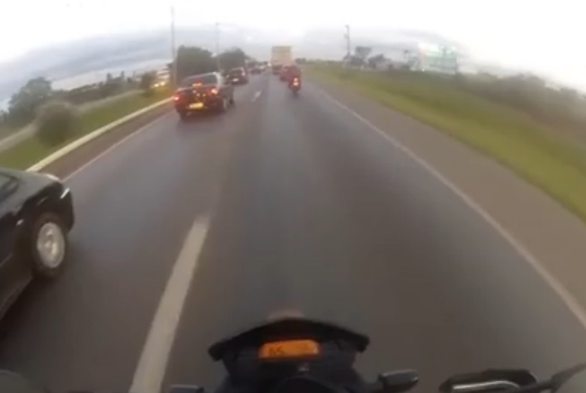 La scène se passe au Brésil, un motard avec une GoPro s'amuse à slalomer entre les voitures au milieu d'une circulation dense.