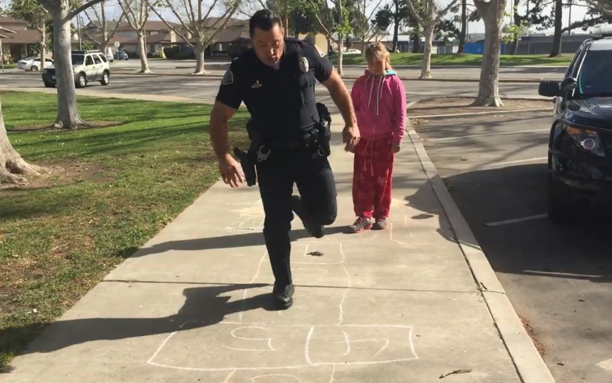 Un policier fait une pause pour jouer à la marelle avec une petite fille