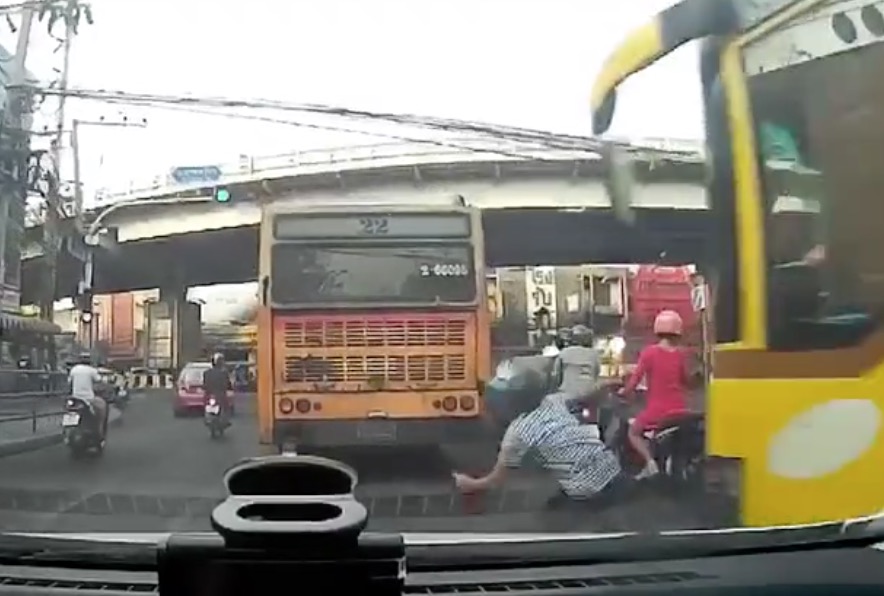 Un thai sur un scooter à deux doigts de se faire tuer par un bus