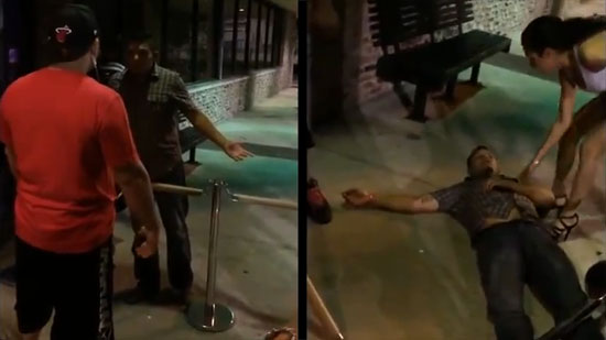 Description : A l'entrée d'une boite de nuit, un videur qui s'embrouille avec un client un peu trop bavard et beaucoup trop sûr de lui, va calmer les choses en lui décollant une sacrée bonne droite. JLBCSDP en talons.