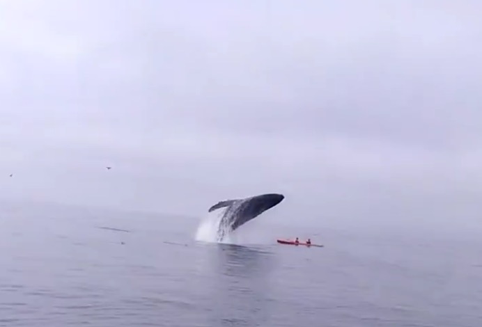 Une baleine saute juste à coté d'un kayak